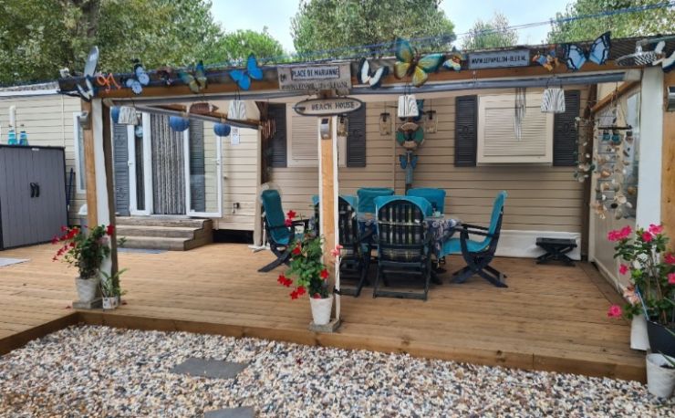 Luxe mobilhome op 200 mtr van de zee met groot vast overdekt terras, voor maximaal 4 personen.